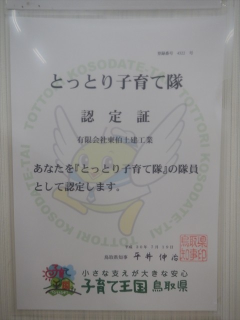 鳥取県知事より「とっとり子育て隊」として認定をいただきました。